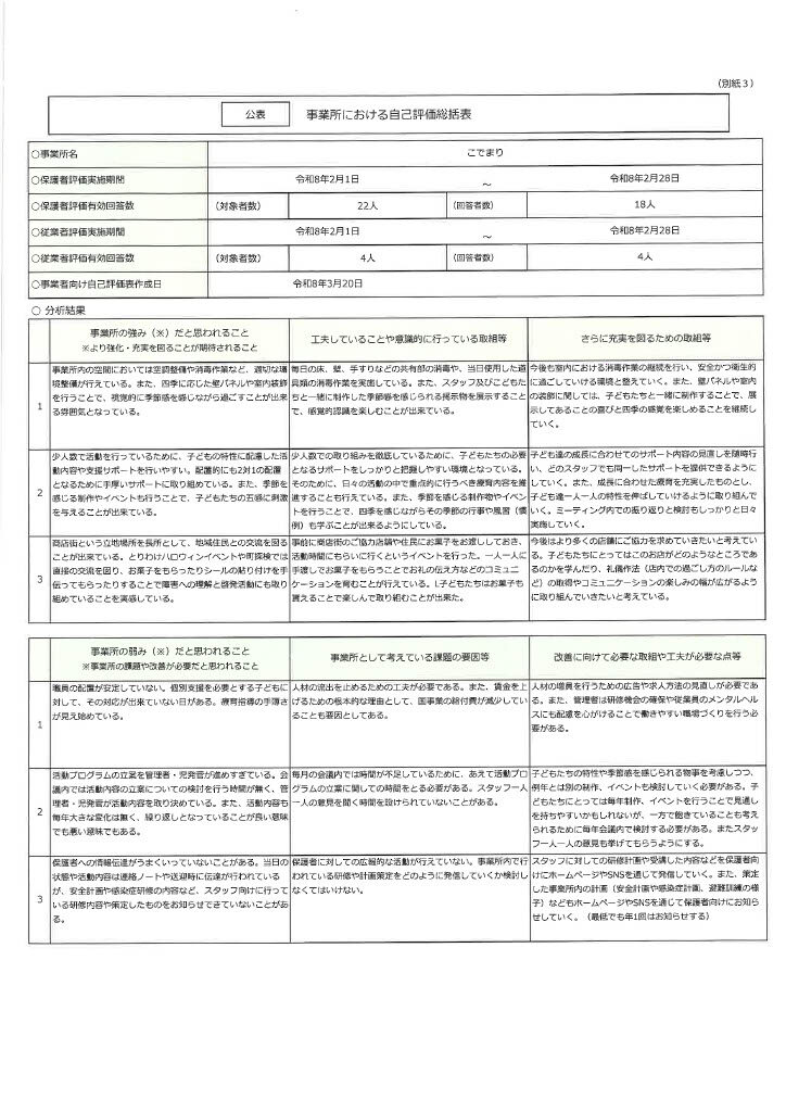 NEW! お知らせ 放課後等デイサービス「こでまり」令和7年度 自己評価表 2026年3月19日 放課後等デイサービス「こでまり」の自己評価表について掲載させて頂きます。 ご協力頂きました保護者の皆...