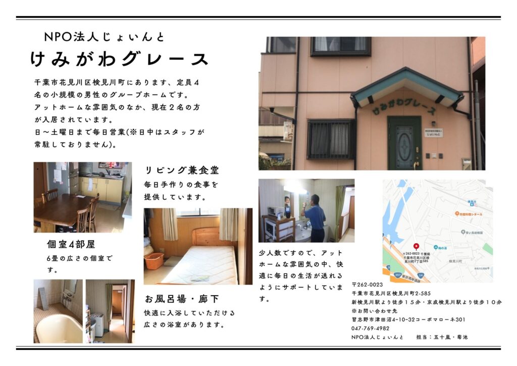 現在、当法人の運営するグループホームにおいてご入居者様を募集しております。ご関心ある方はチラシの連絡先までお気軽にご連絡ください。ご案内、ご体験宿泊も可能です。