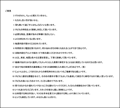 令和4年度 ご利用者様向け 事業所向け 保護者様からのご意見 令和3年度 ご利用者様向け 事業所向け 保護者様からのご意見 令和2年度 ご利用者様向け 事業所向け 保護者様からのご意見 令和元年度 ご利用者様向け 事業所向け 保護者様からのご意見 平成30年度 ご利用者様向け 事業所向け
